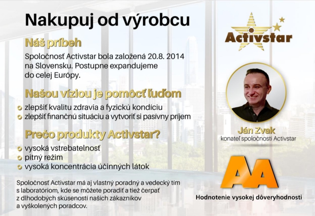 Nákup přímo od výrobce Activstar přináší skutečně výrazné výhody. Do rukou se dostávají vždy čerstvé produkty z aktuálních výrobních šarží, bez zbytečných mezičlánků, které prodlužují dobu skladování a zbytečně navyšují cenu.